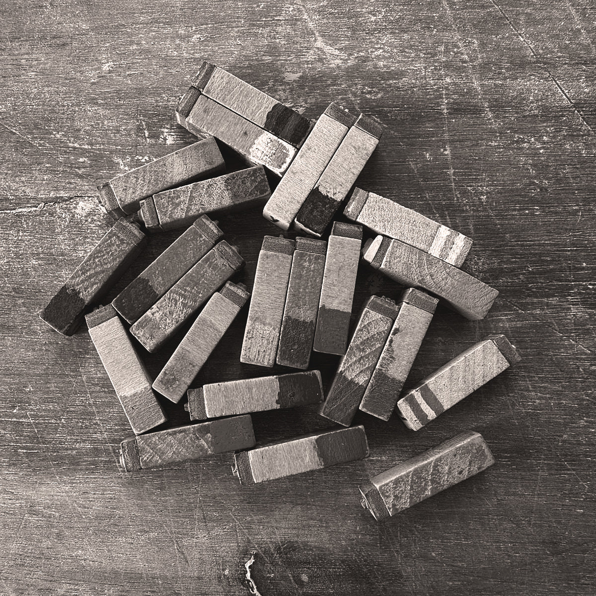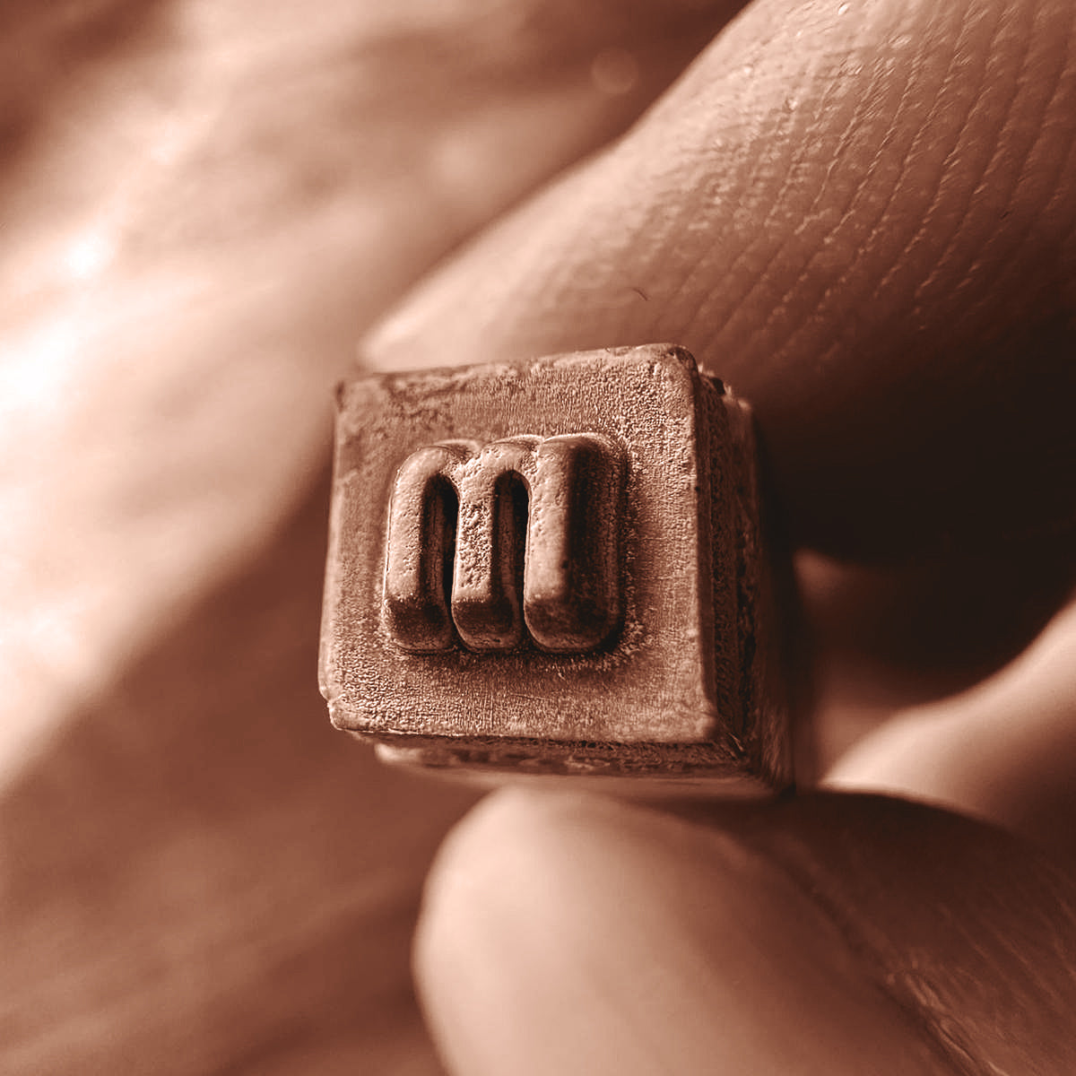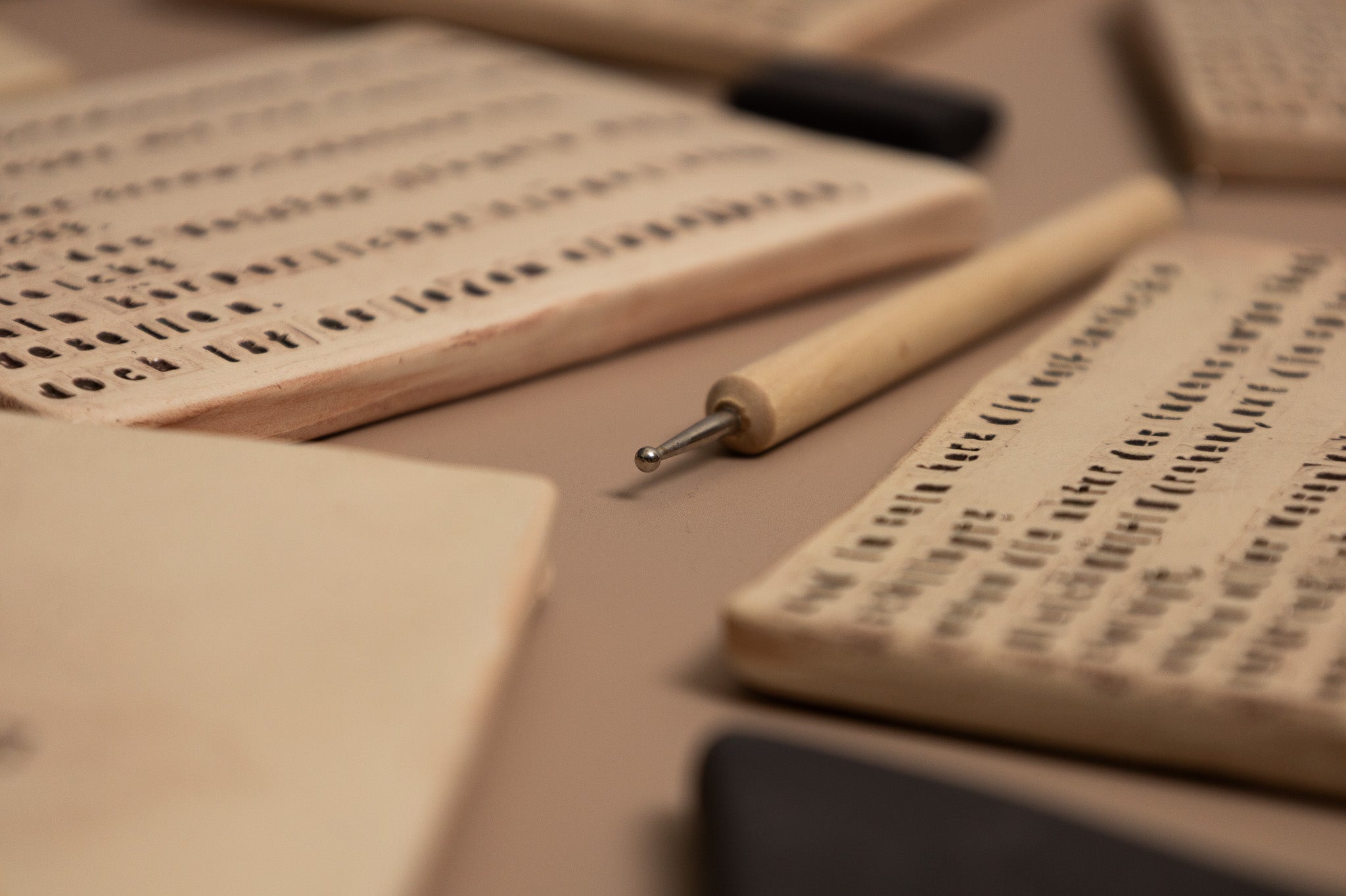 Jede Platte trägt einen individuell geprägten Text — entweder aus meinem Faustplatz-Projekt oder nach Wunsch. Ich arbeite mit einer hellcremefarbenen Tonmasse auf DIN A6 und präge die Buchstaben mit einem historischen Stempelset aus den 1950er Jahren, das ursprünglich für Museumsbeschriftungen genutzt wurde.