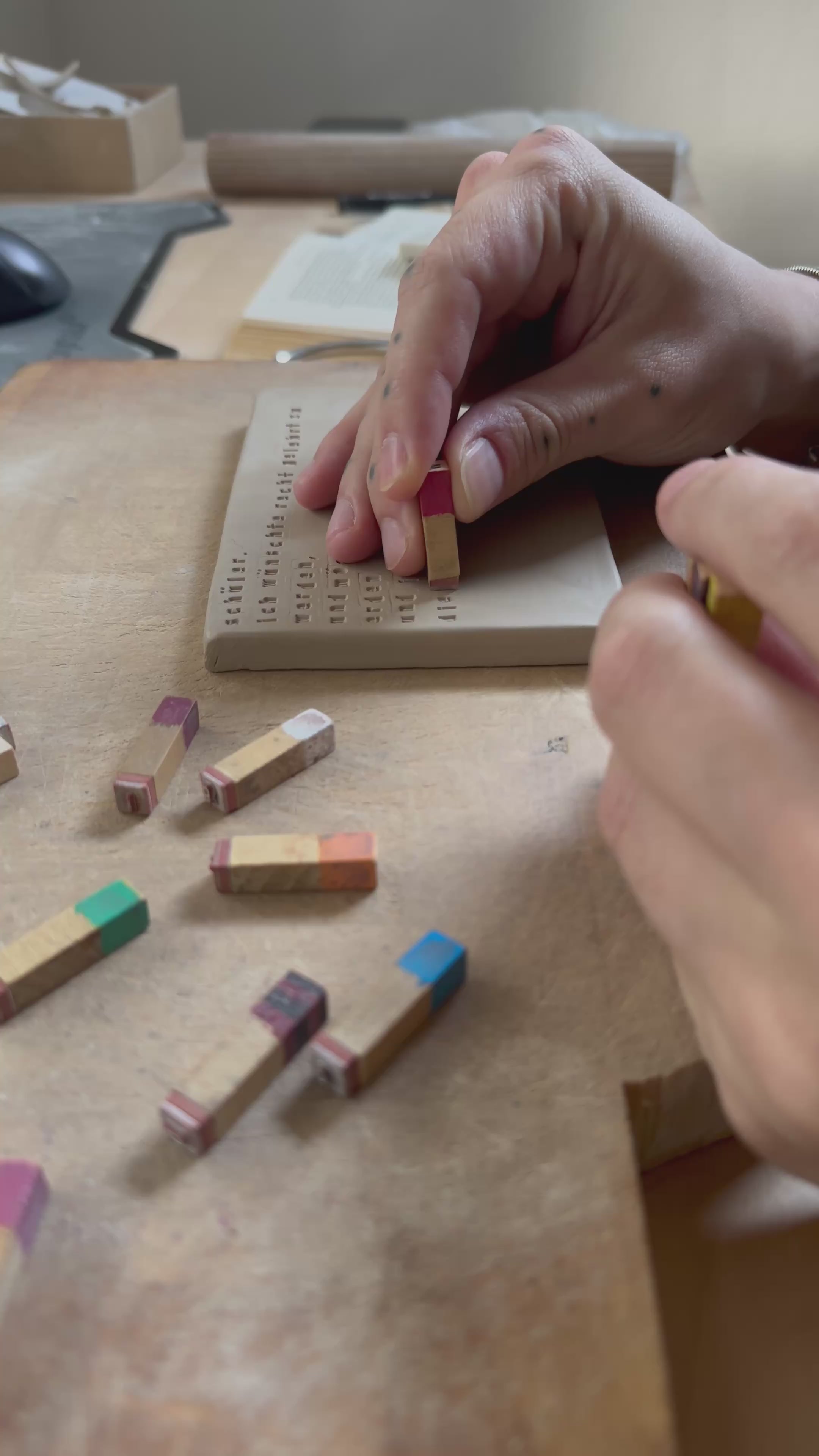 In meinen Live-Performances wird dieser Prozess vor Ort erlebbar: Für einige Stunden entsteht bei dir ein echtes Fragment des Faustplatzes. In ruhiger, konzentrierter Arbeit präge ich Tonplatten mit historischen Holzstempeln – sichtbar, greifbar, entschleunigt. Die vor Ort gefertigten Kacheln werden dauerhaft Teil des Gesamtwerks.