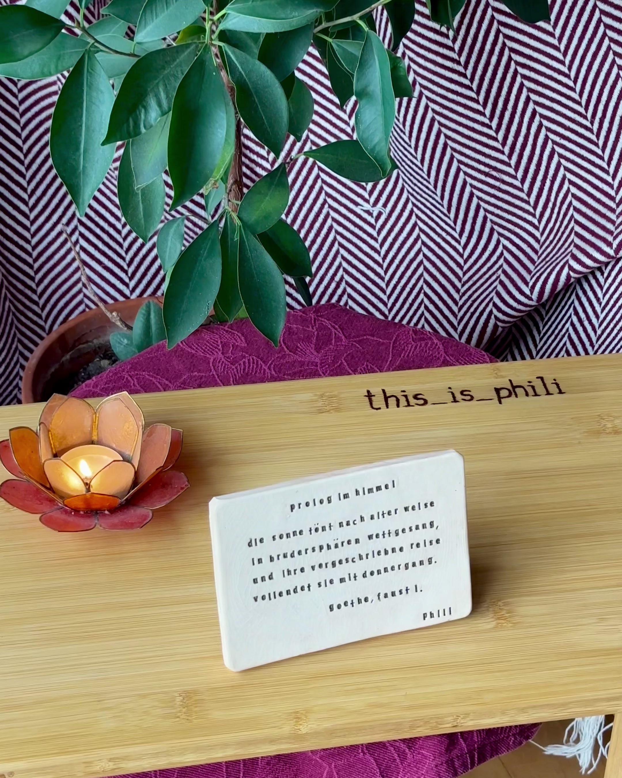 Jeden Monat entsteht eine neue, limitierte Kachel mit einem ausgewählten Text aus Goethes Faust I. Die Kacheln stehen für sich – und lassen sich zugleich sammeln.